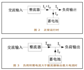 (2)當負荷呈大電流時,整流器自身已不能滿足負荷要求,即超過整流器所能輸出的最大電流IMsx,這時,將由整流器和蓄電池同時供電,蓄電池輸出電流為IF,向負荷提供的電流輸出為IL,IL=IF+IMAX,如圖3所示。