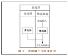 2直流屏作業(yè)原理圖1為直流屏作業(yè)原理簡圖。在圖1中,蓄電池和整流器組成了變電站的直流屏,當有溝通輸入電源時,整流器作業(yè),把溝通電整流成直流電,與蓄電池一同協(xié)作,供給直流負荷安穩(wěn)的直流電源。