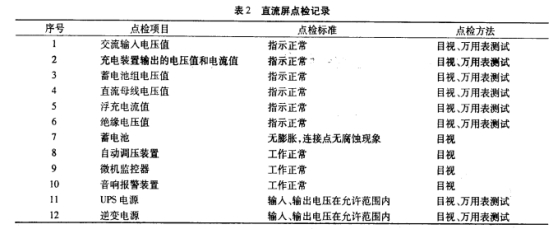 首要需求編制點檢標準,編制出符合實際出產(chǎn)需求的點檢標準,使其他點檢者能快速、簡潔履行點檢標準。點檢標準的內(nèi)容觸及方面比較多,列入點檢處理規(guī)模的部位也比較多,例如直流屏,交流輸入電壓值、充電設(shè)備輸出的電壓值和電流值、蓄電池組電壓值、直流母線電壓值、浮充電流值、絕緣電壓值、蓄電池、主動調(diào)壓設(shè)備、微機監(jiān)控器、音響報警設(shè)備、UPS電源、逆變電源等都是關(guān)系到直流屏安全作業(yè)的重要參數(shù)及設(shè)備,確認為點檢部位。點檢部位確認后,就要履行點檢內(nèi)容,點檢辦法現(xiàn)在還是以簡單東西、儀器和人的感觀為主的點檢辦法。因而,點檢內(nèi)容首要是檢查設(shè)備溫度、電壓、表計指示、作業(yè)情況等方面參數(shù)。直流屏設(shè)備點檢作業(yè)首要是以日常點檢為主,守時點檢為輔。日常點檢首要以人的感官為主,通過聽、摸、看.擰等辦法對作業(yè)中的設(shè)備進行一個外觀的檢查。通過每日進行的點檢作業(yè),及時發(fā)現(xiàn)設(shè)備存在的風險并消除,使設(shè)備長周期安全作業(yè)。由于直流屏的特殊性,展開的直流屏設(shè)備專業(yè)點檢也很重要,點檢辦法以工用具、表面和人的感觀為主的點檢辦法。通過守時進行的點檢作業(yè),及時發(fā)現(xiàn)設(shè)備存在的風險并消除,使設(shè)備長周期安全作業(yè),見表2。